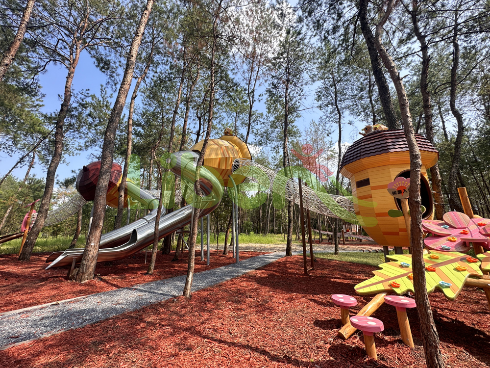 主設(shè)備是由三顆大松果組成的樹屋,小朋友仿佛是一只只小松鼠,在鉆洞、爬網(wǎng)內(nèi)穿梭,在踩樁、攀巖上爬行,在滑梯里滑下樹屋等。可以鍛煉到小朋友的平衡感,提高小朋友的心理素質(zhì),同時(shí)可以在玩耍過程中結(jié)交新的朋友,提高小朋友的社交能力等。