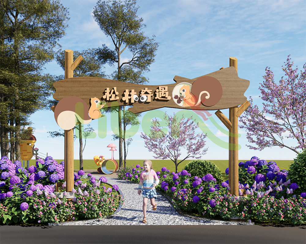 仙居艾綠芳香度假小鎮(zhèn)兒童戶外樂園,位于浙江省臺(tái)州市仙居縣的一片松林中,以松鼠為主題的樂園。滿足孩子們對(duì)大自然的向往,置身于松林中,仿佛自己就是那一只活躍自在的小松鼠。門頭由黃花梨木立柱以及防腐木板組合而成,“松林奇遇”以及松鼠造型由PE板拼接而成,與場(chǎng)地綠化環(huán)境融為一體,門頭醒目且融洽。